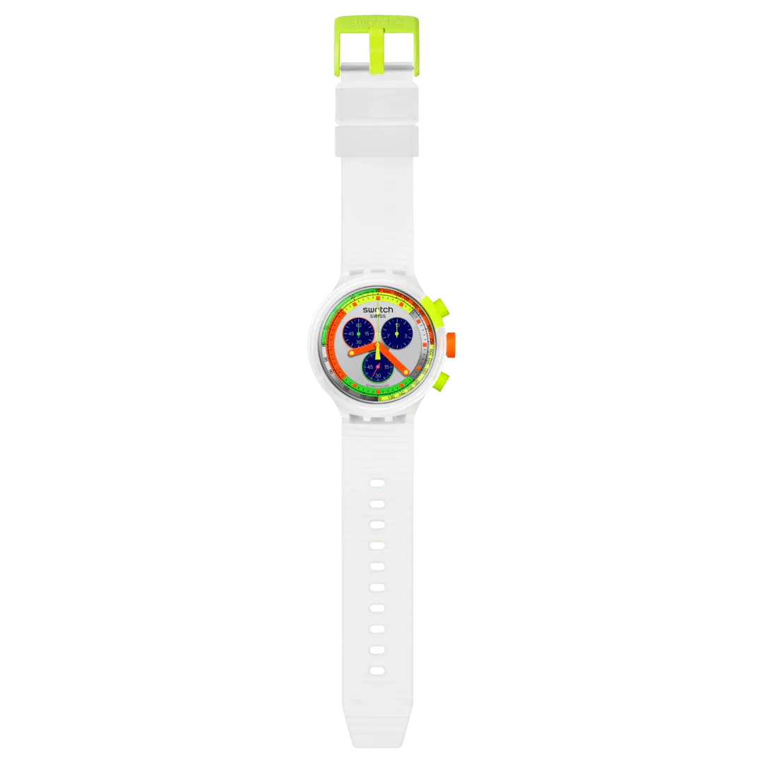 Αυτό το μεγάλου μεγέθους ρετρό ρολόι εμπνέεται από ένα Swatch CHRONO της δεκαετίας του ‘90: το JELLY STAG (SCK104). Τα χαρακτηριστικά που το κάνουν να ξεχωρίζει είναι τα πολλά και ζωηρά χρώματα του καντράν με την ταχυμετρική κλίμακα, στοιχεία που συμπληρώνονται από τον πορτοκαλί ωροδείκτη και λεπτοδείκτη και τον κίτρινο δείκτη δευτερολέπτων που λάμπουν στο σκοτάδι. Το ρολόι διαθέτει διαφανή ματ κάσα και στεφάνη με πορτοκαλί κορώνα, κίτρινα κουμπιά πίεσης και μια λεπτομέρεια στη στεφάνη. Το σχέδιο ολοκληρώνεται με το διαφανές ματ ανάγλυφο λουράκι με τα ταιριαστά θηλάκια και το κίτρινο μισό κούμπωμα